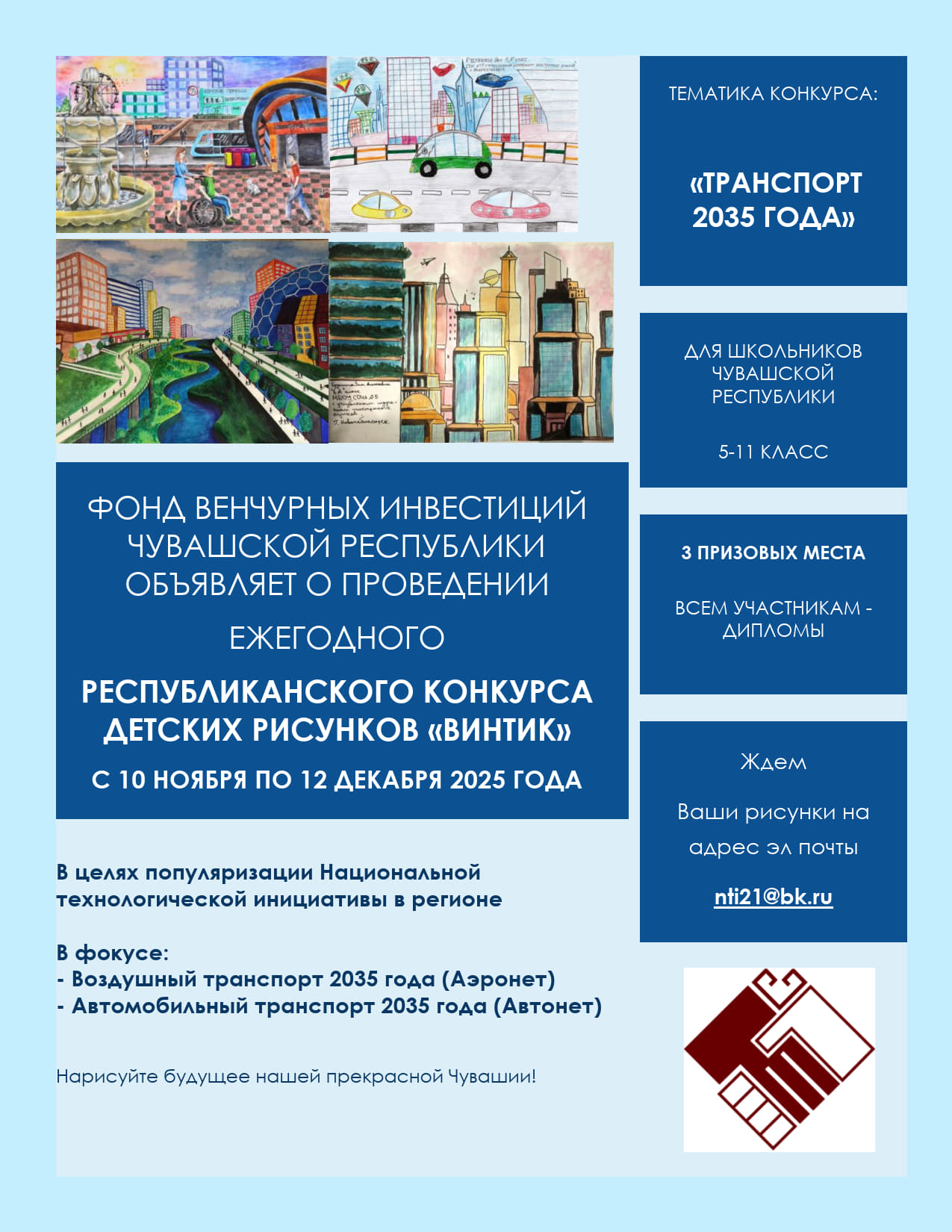 Фонд венчурных инвестиций Чувашской Республики объявляет о проведении ежегодного республиканского конкурса детских рисунков для школьников Чувашской Республики с 5 по 11 класс - «ВиНТИк. Транспорт 2035 года».